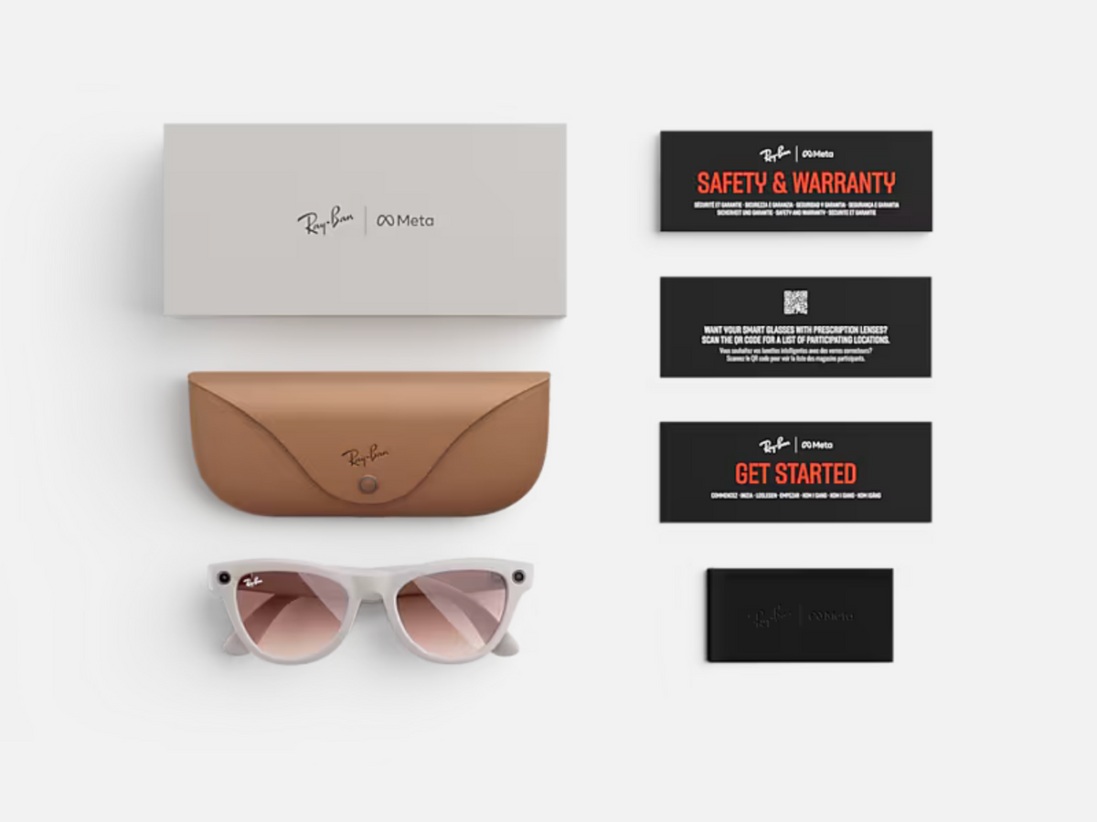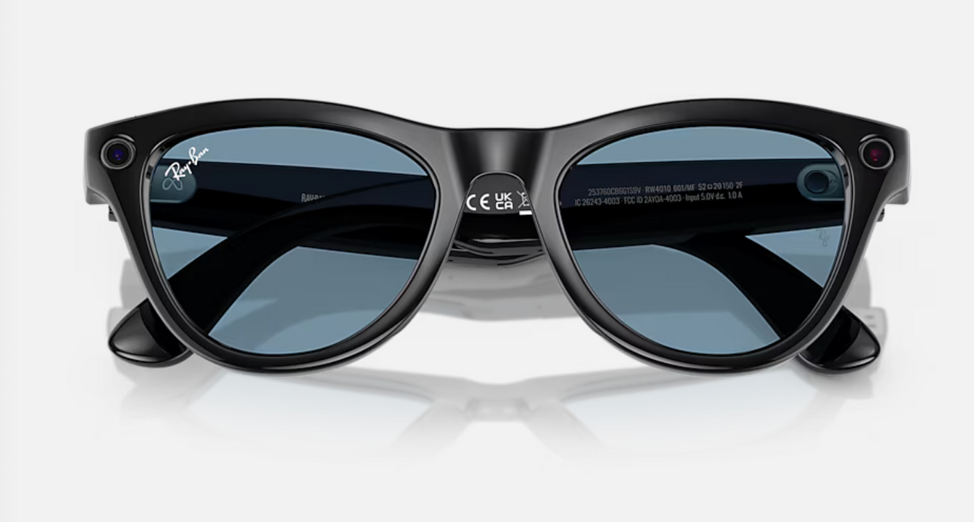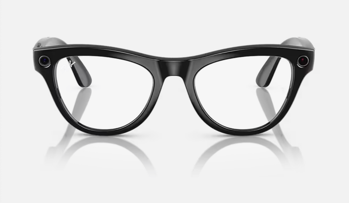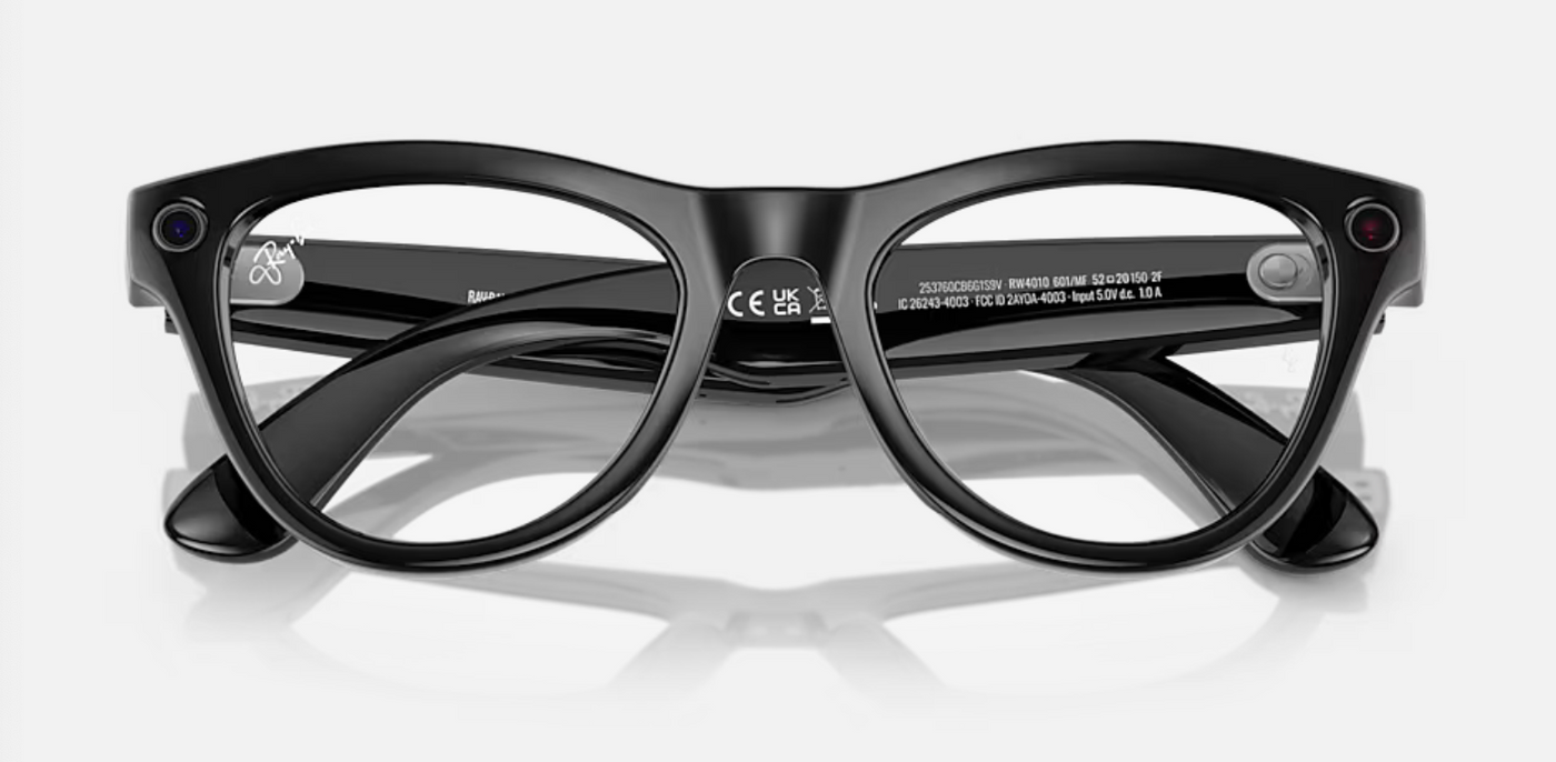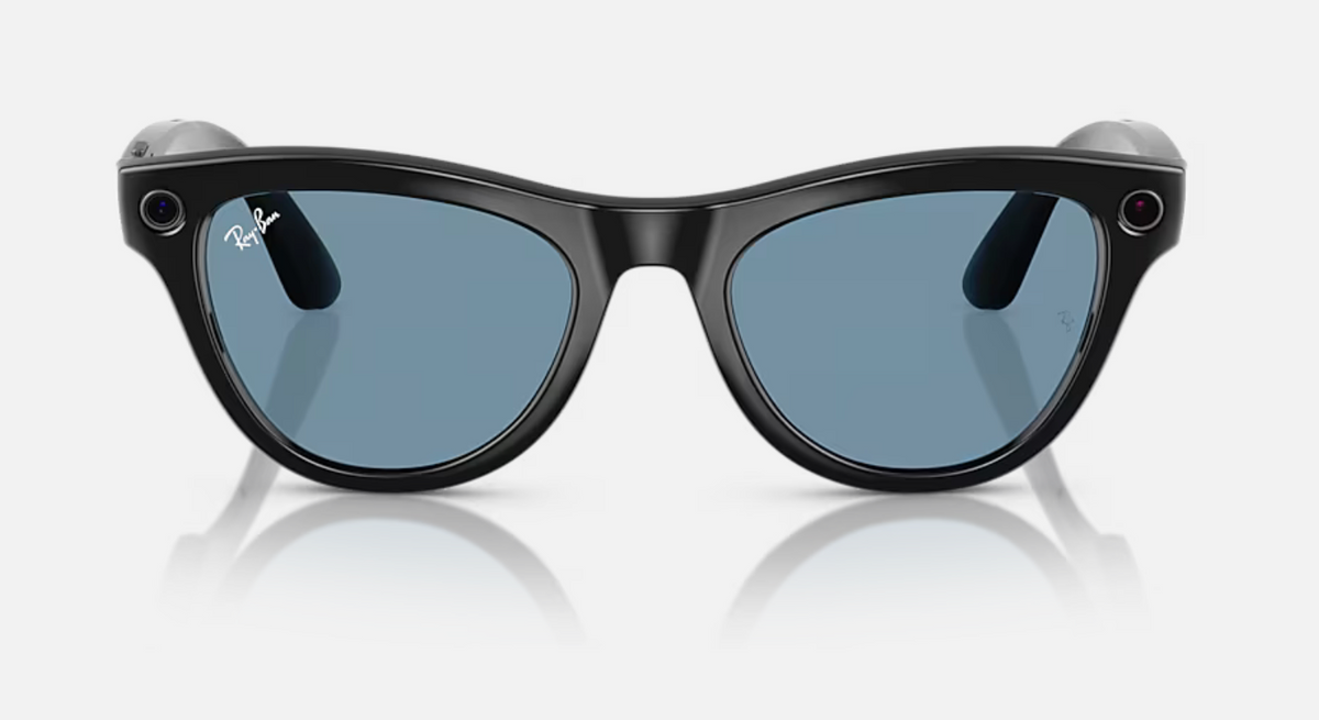 The RAY-BAN 0RW4010 Meta Skyler (Gen 1) features shiny black frames paired with innovative Transitions® lenses that shift from clear indoors to cerulean blue outside, providing full UVA and UVB protection. Equipped with a 12 MP ultra-wide camera, two open-ear speakers, and a 5-mic array, these AI glasses enable hands-free calls, messaging, capturing photos and videos with stunning clarity. With 32 GB storage and up to 36 hours battery life using the charging case, they offer both style and advanced connectivity for a seamless, sophisticated experience.