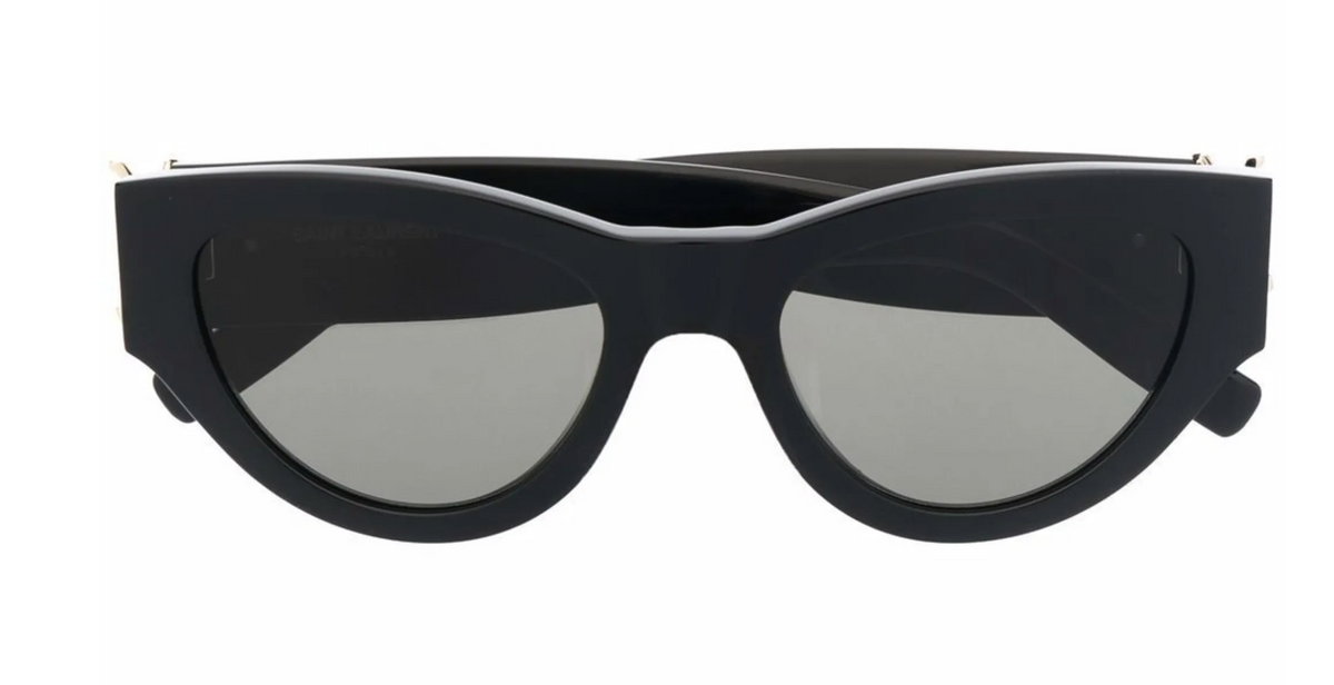 The Saint Laurent SLM94F sunglasses showcase a bold cat-eye frame crafted from 100% black acetate with a subtle semi-matte finish. Made in Italy, this sophisticated design features oversized arms, curved tips for comfort, and the signature Cassandre logo plaque. Tinted lenses offer elegance and protection, and each pair comes with a protective case for refined style and practicality.